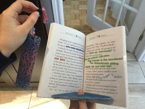 The Bookworm is a product that helps you hold a book open with one hand. This product is useful for anyone who reads a book; from students to teachers, and from young children to the elderly. You can get Bookworms in three different colors, green, blue and purple. The general shape of the Bookworm is a triangle. The top edge of the Bookworm has a wavy design. At the bottom of this tool is a 80o corner that is placed in the middle of the book to keep the book open when you are reading. A rubbery seal covers the whole contour of the Bookworm. There is velcro on the corner of the bookworm and the other piece of velcro on a string that is tied onto a bookmark so that you can attach the bookmark to the bookworm. When you’re finished reading you can hold your place with the bookmark provided with the Bookworm.